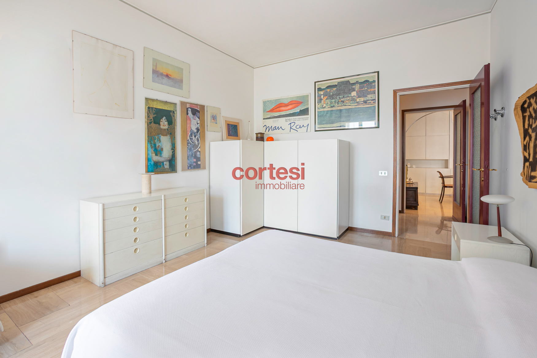 La zona notte comprende la camera padronale con terrazza privata, due ulteriori camere da letto entrambe servite da balcone e due bagni: uno completo con vasca e l’altro dotato di doccia e con accesso a un piccolo balconcino di servizio.