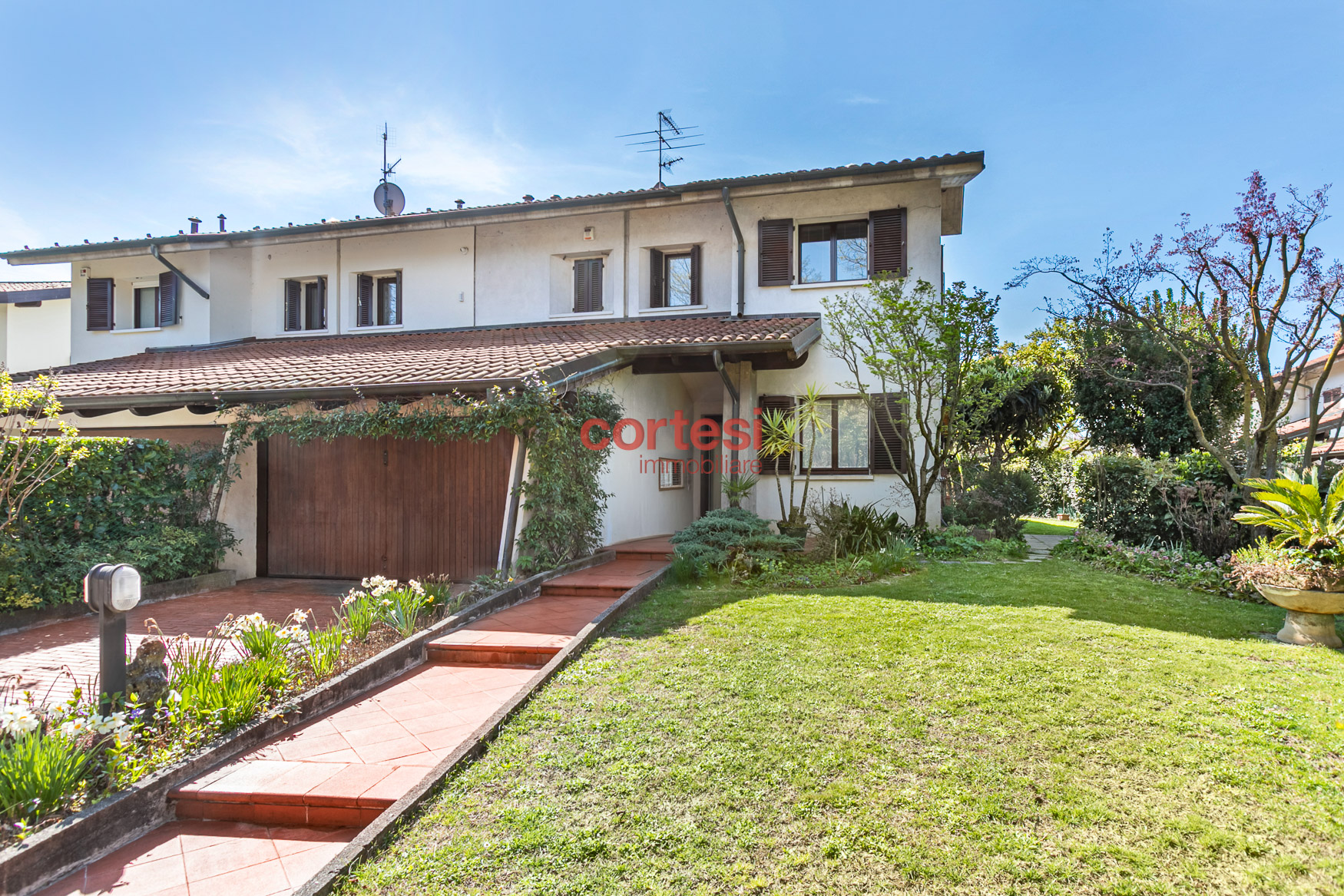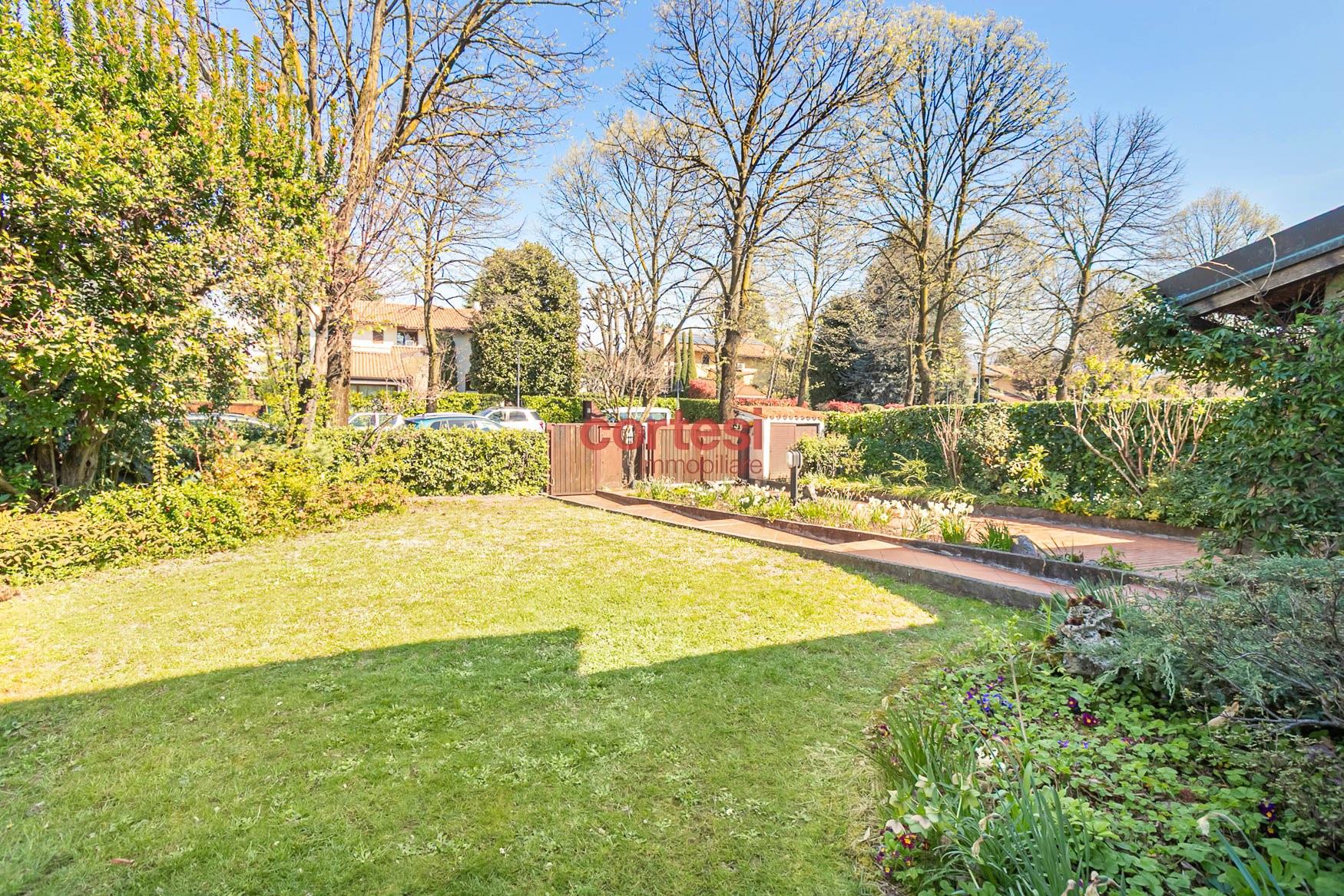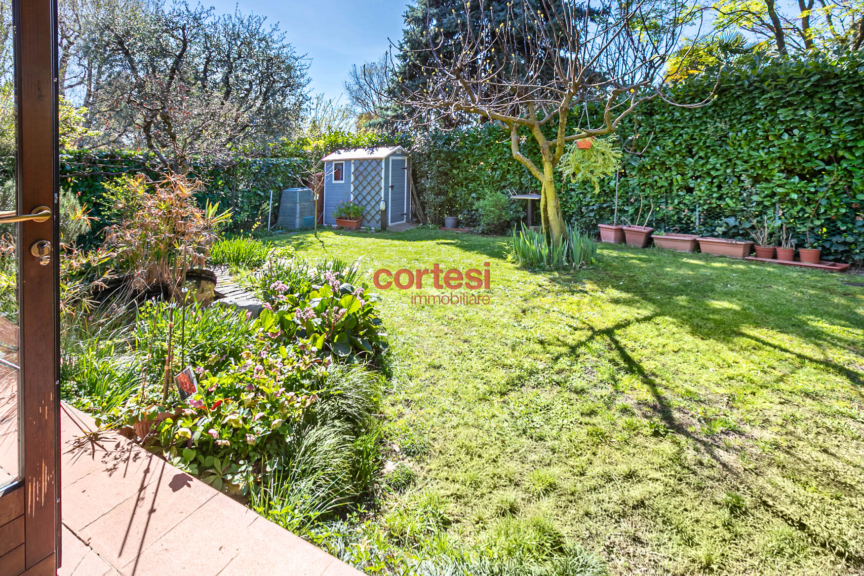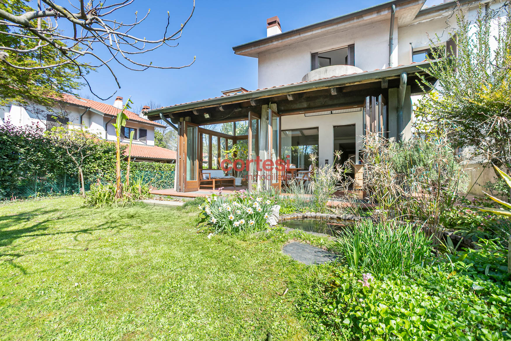 All’esterno il giardino, sapientemente piantumato, offre un prato pianeggiante, aiuole fiorite, siepi per privacy ed un suggestivo laghetto ornamentale con piante acquatiche, creando molteplici zone relax e conviviali oltre ad un possibile angolo barbecue.