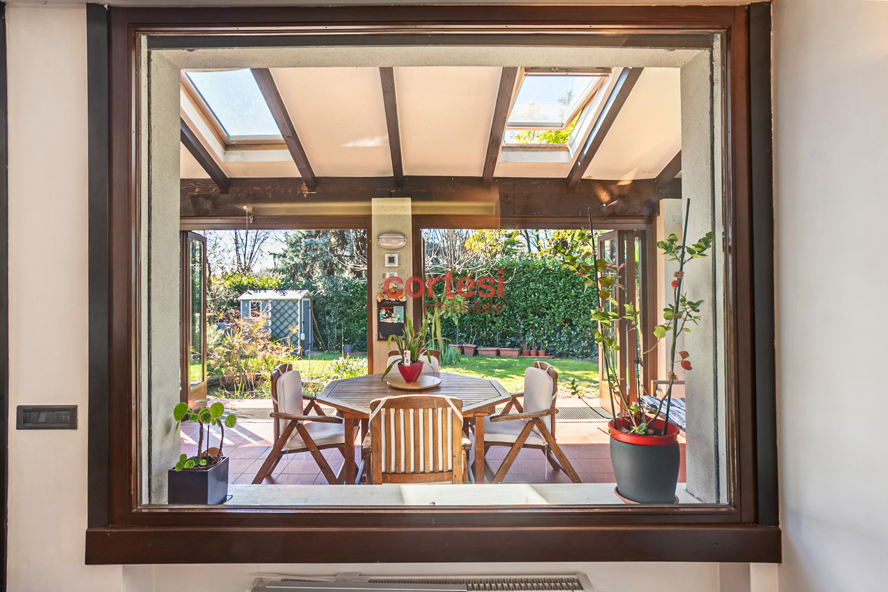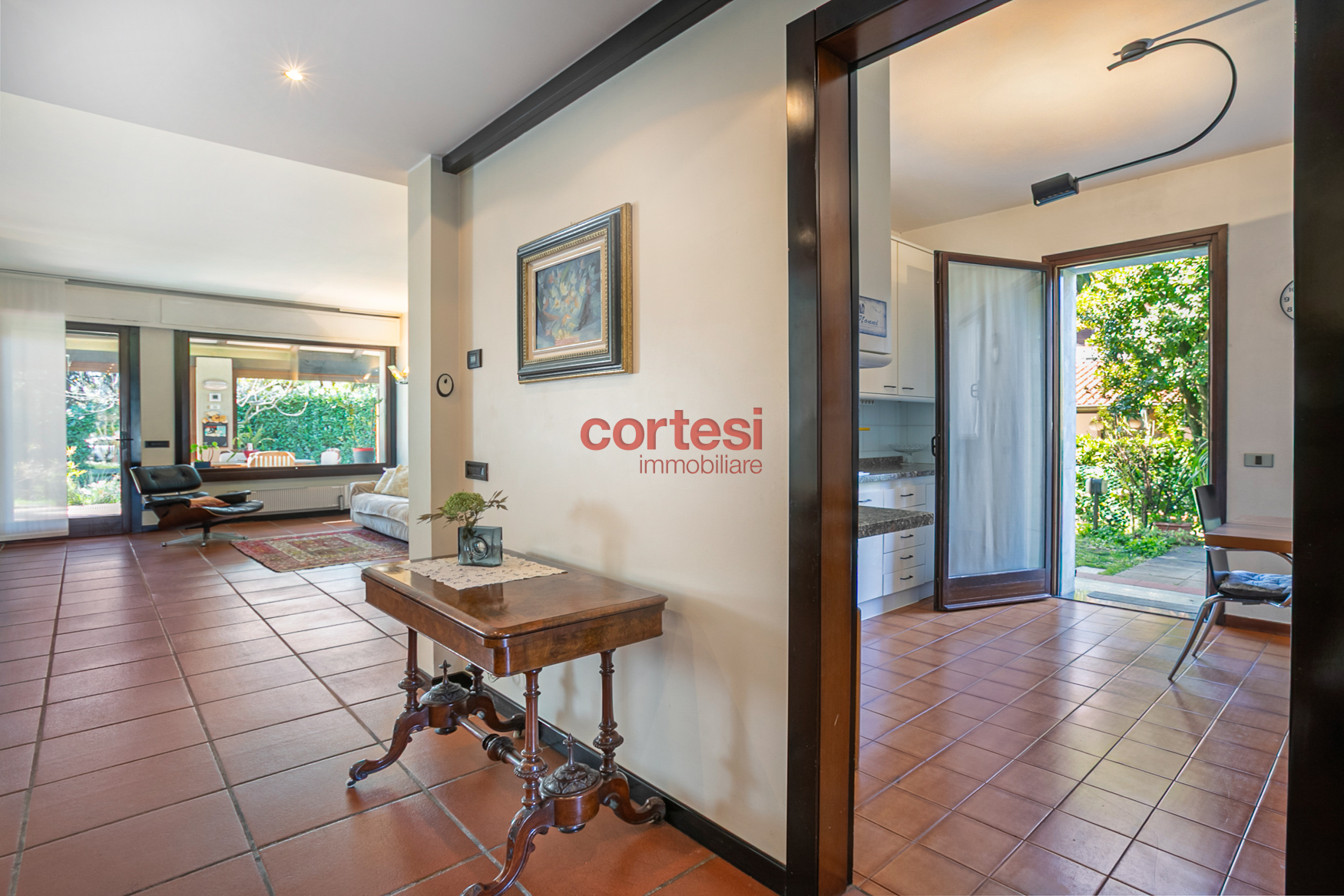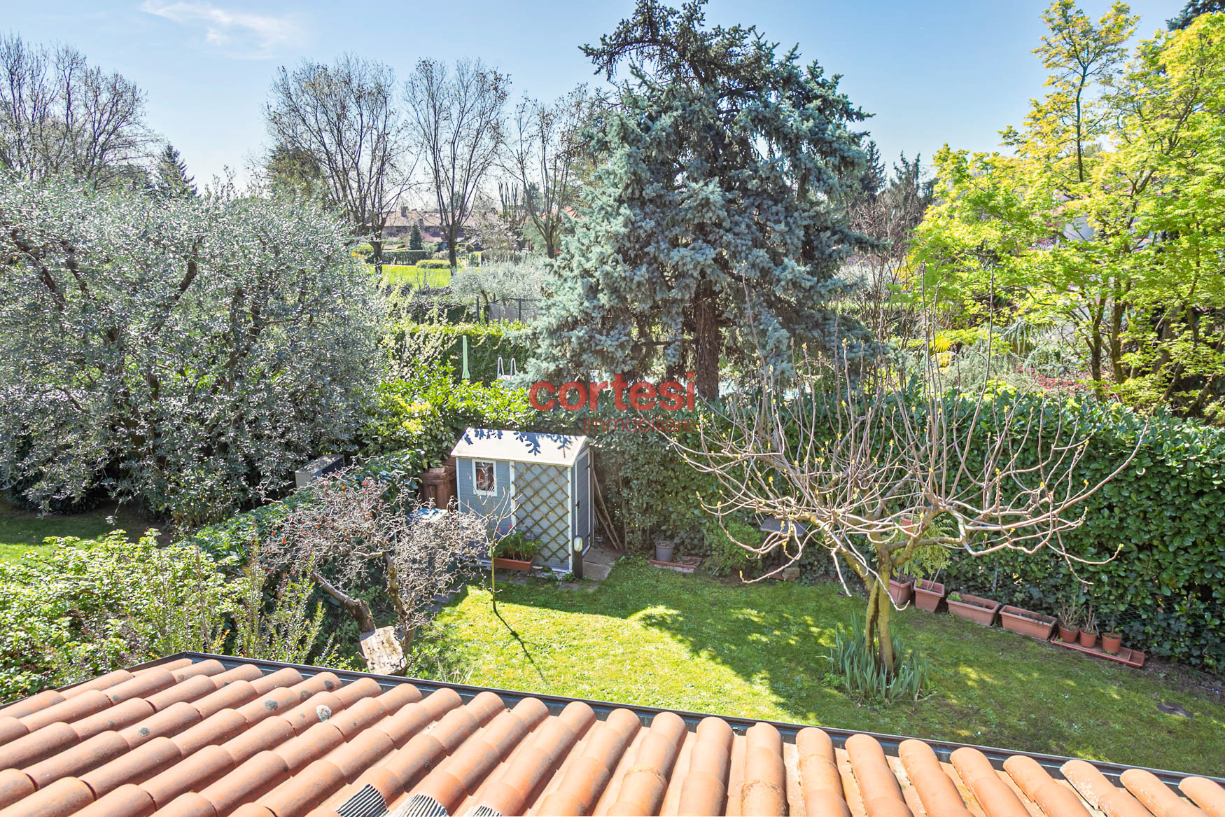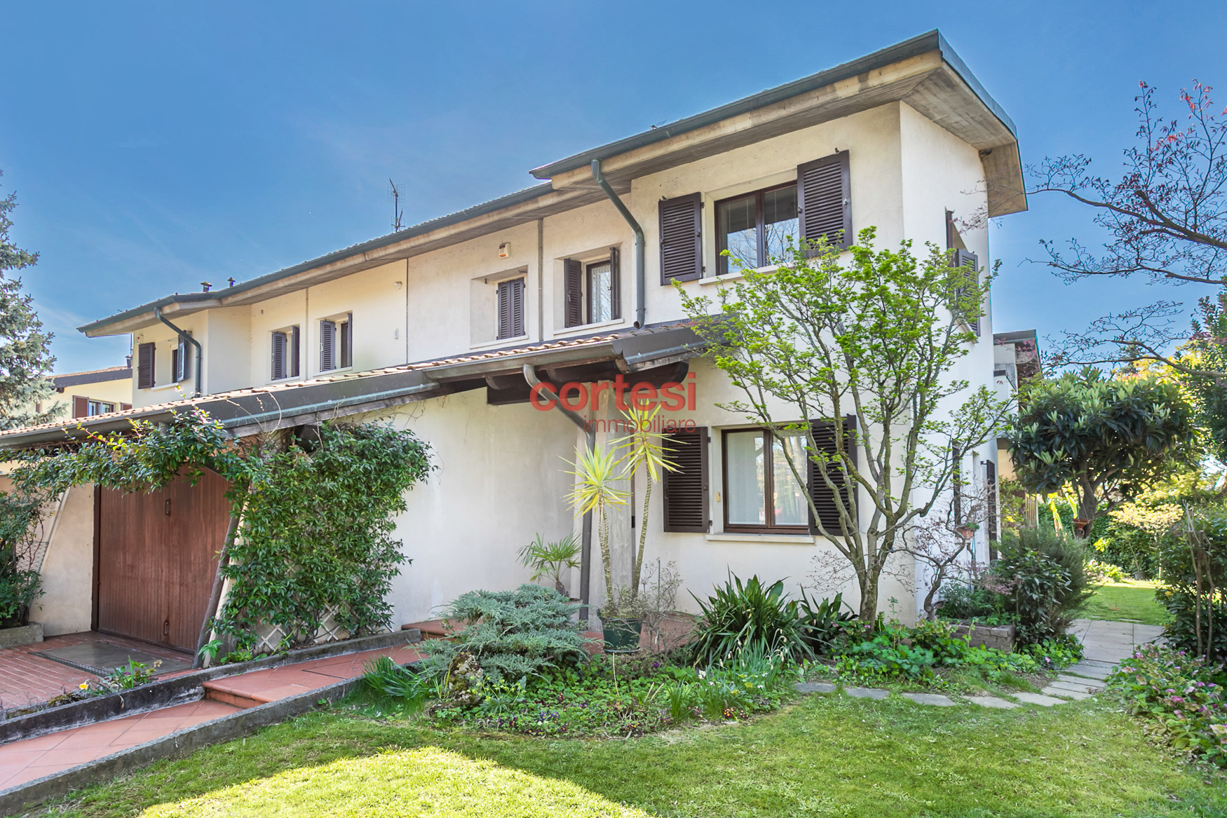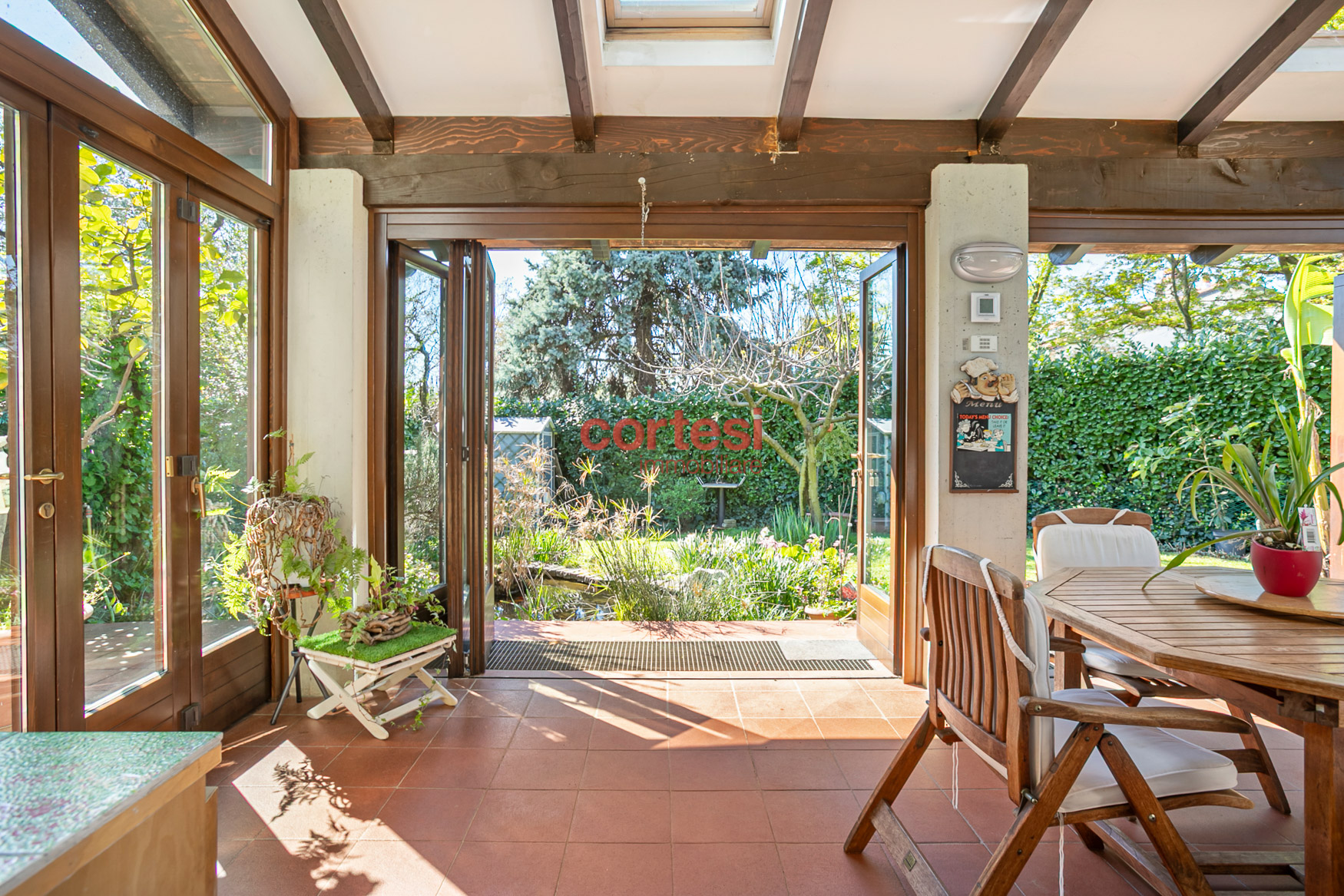All’esterno il giardino, sapientemente piantumato, offre un prato pianeggiante, aiuole fiorite, siepi per privacy ed un suggestivo laghetto ornamentale con piante acquatiche, creando molteplici zone relax e conviviali oltre ad un possibile angolo barbecue.
