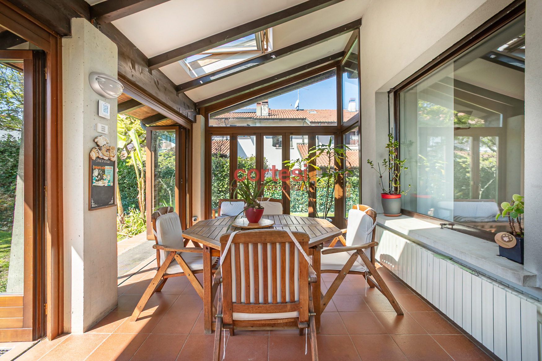 La sua disposizione è la seguente: al piano terra si apre una generosa zona giorno con soggiorno e pranzo, collegata direttamente ad una luminosa veranda vetrata con struttura in legno, ideale come living stagionale o sala da pranzo conviviale; completano il piano una cucina abitabile separata e un bagno di servizio.