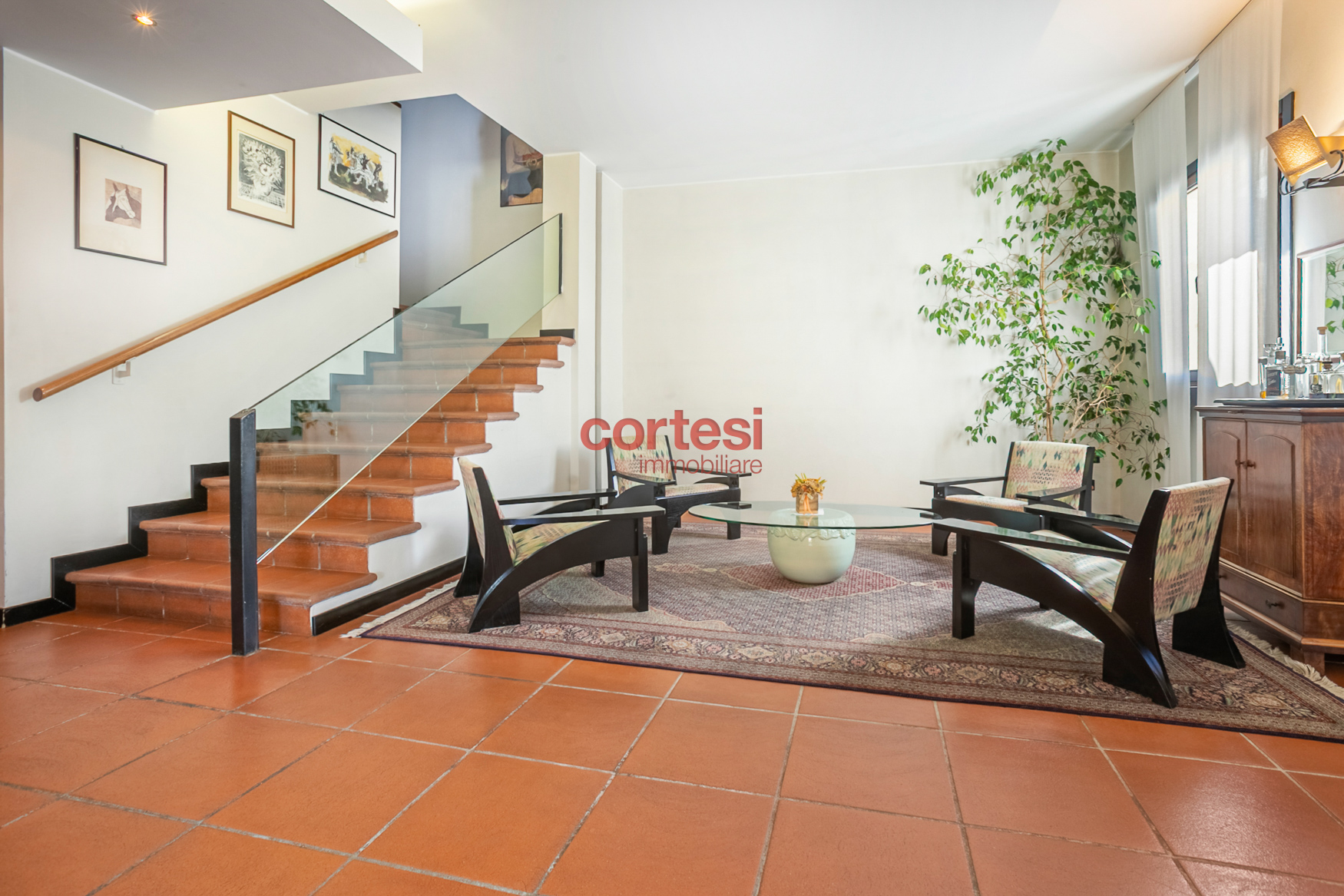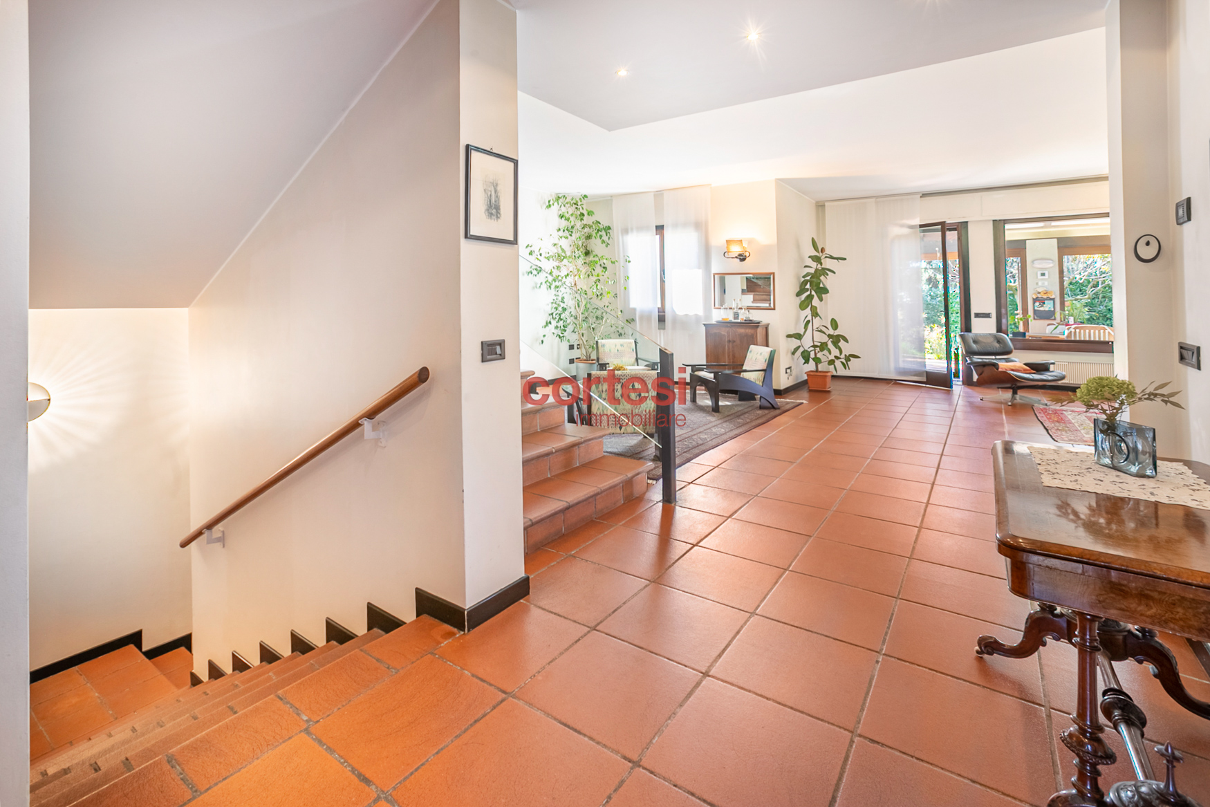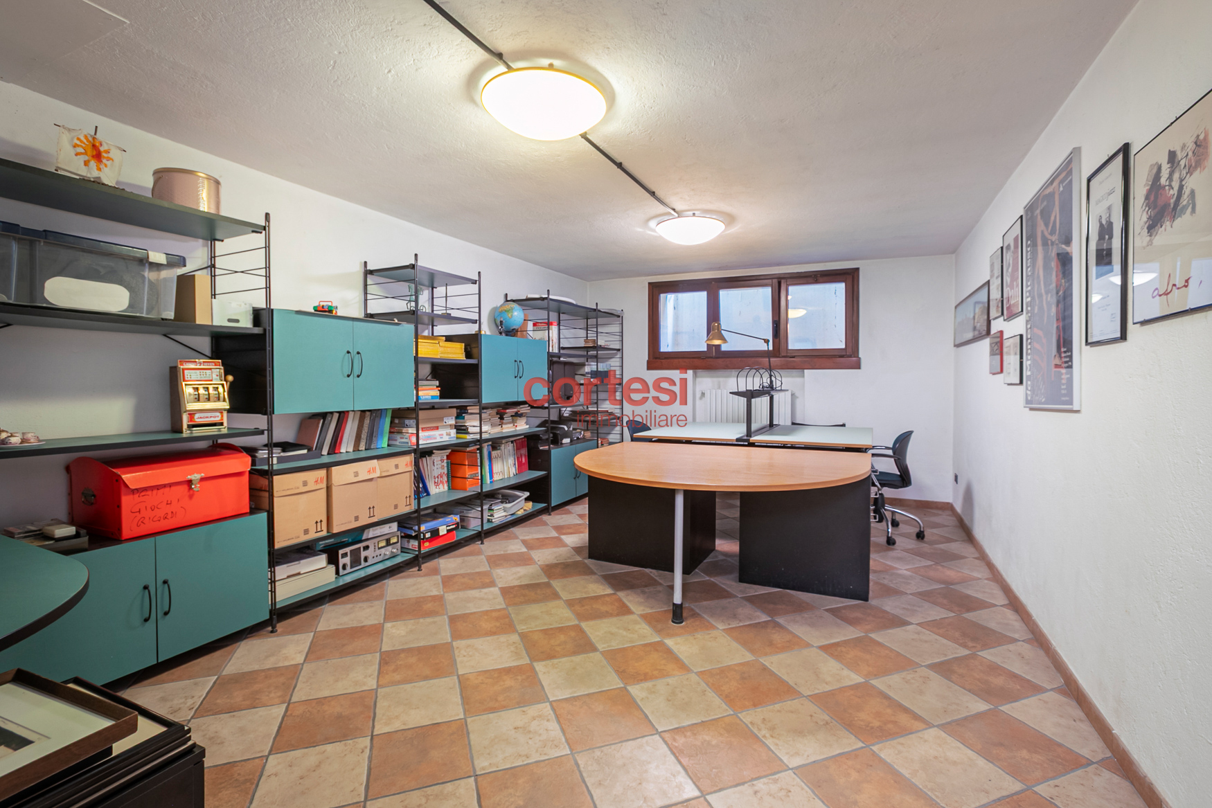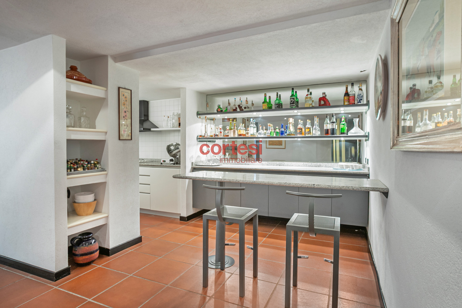 Sempre dalla medesima scala, si accede al piano semi‑interrato che ospita una splendida taverna di circa 150 mq con cucina attrezzata e angolo bar, ambiente ideale per intrattenimento e tempo libero; è presente anche un ingresso secondario che tramite scala esterna porta direttamente al giardino; nella stessa area sono presenti lavanderia, bagno di servizio e uno studio/ufficio.