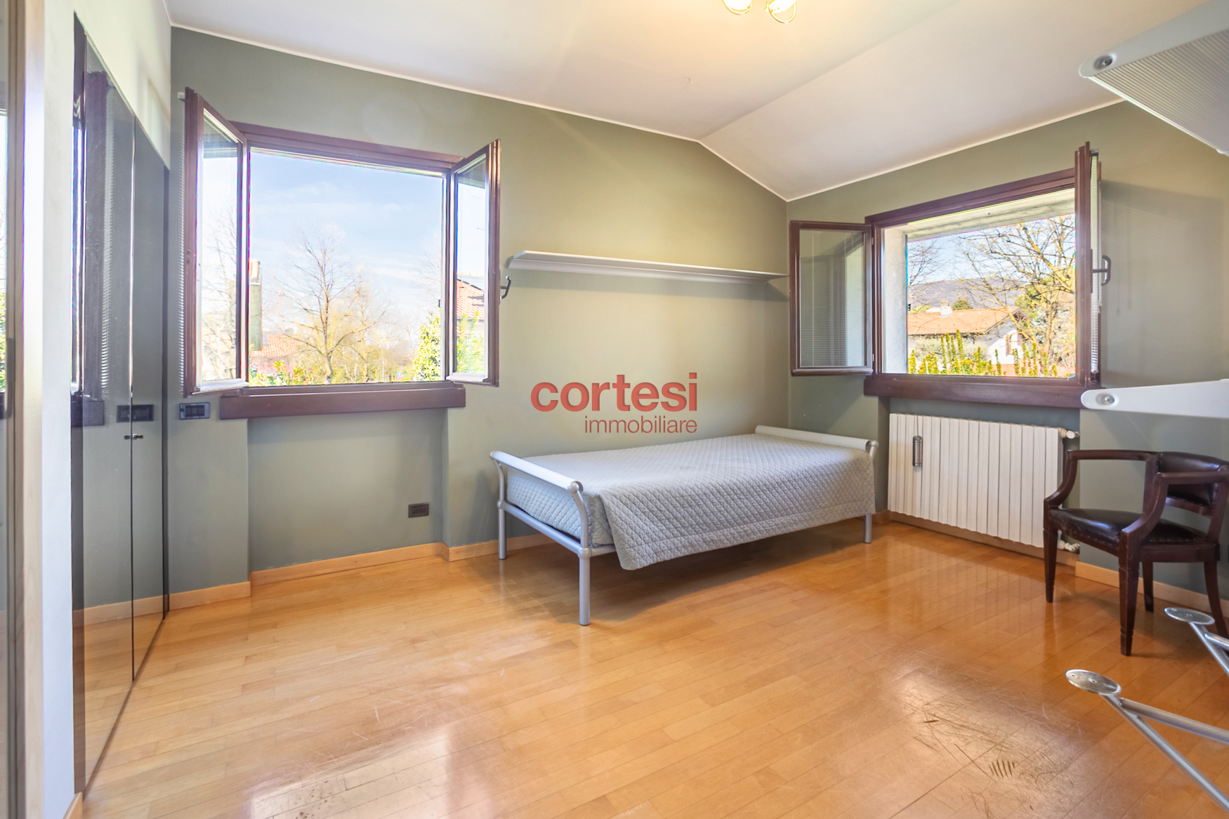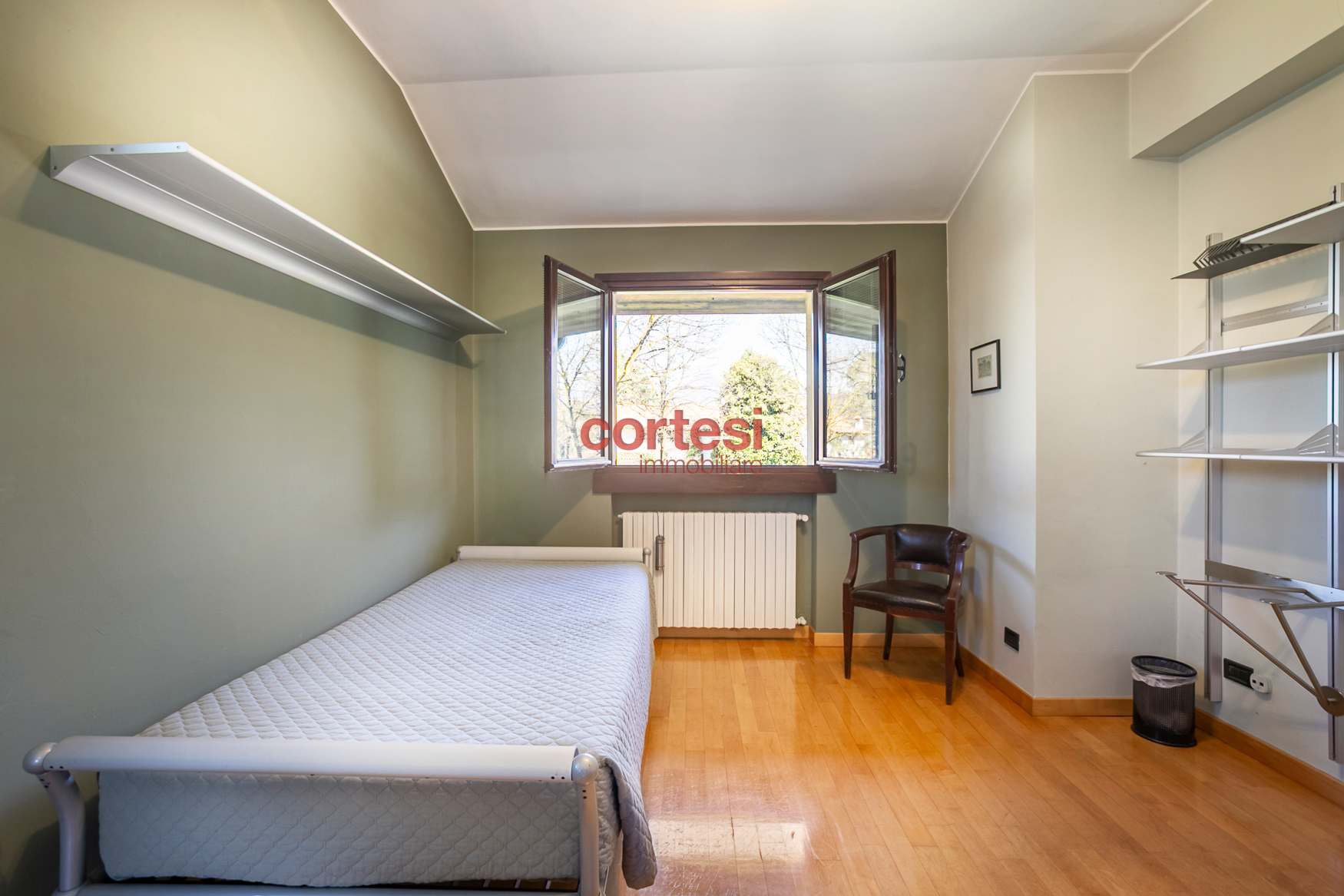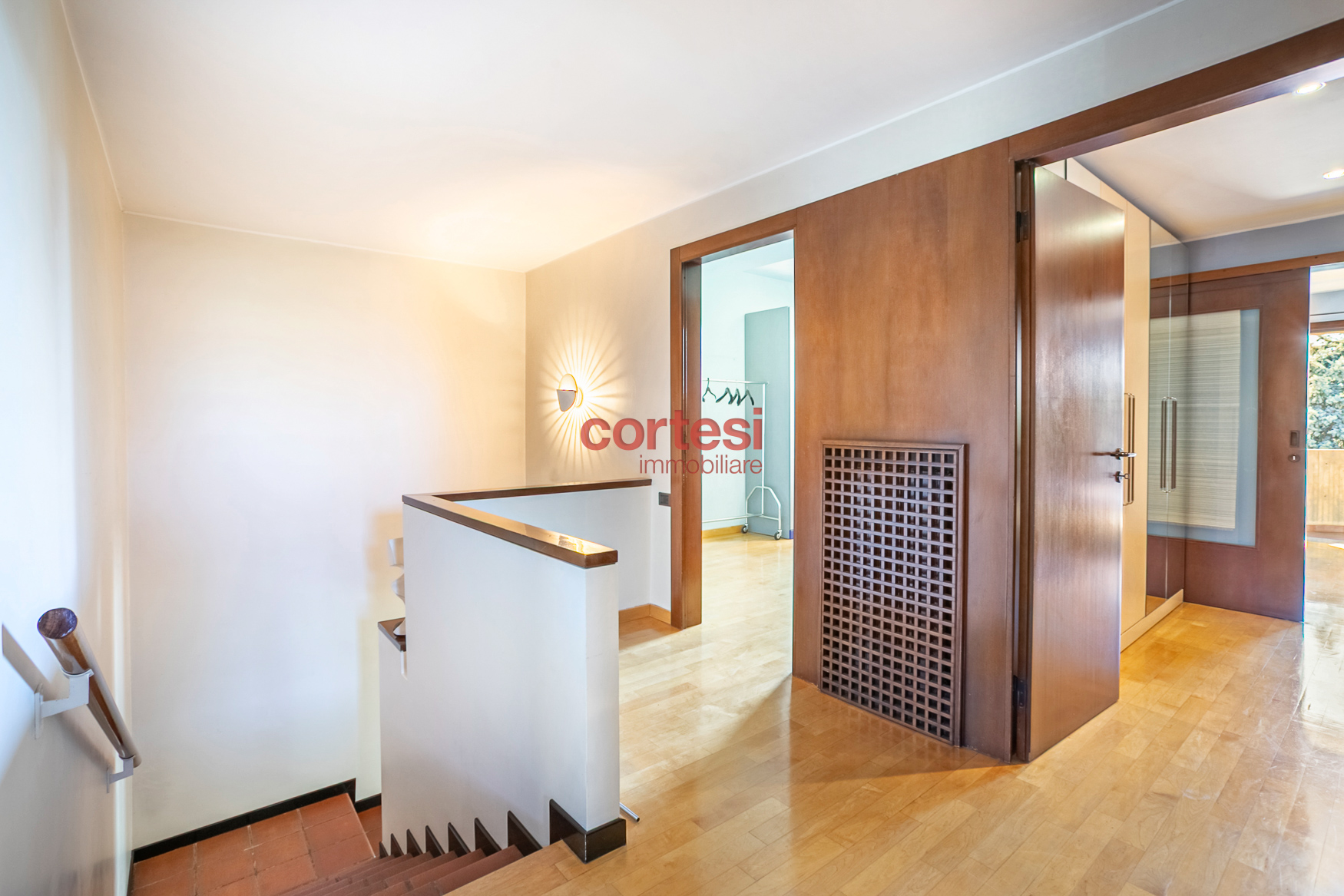 Una scala interna conduce al primo piano, dedicato alla zona notte, dove si trova la camera padronale con balcone affacciato sul giardino e sul parco e bagno en‑suite con vasca in muratura; una seconda camera di generose dimensioni, una camera singola e un bagno con ampia doccia completano il piano. Dal disimpegno si accede inoltre alla mansarda, attualmente adibita a quarta camera con bagno privato, perfetta come spazio riservato o studio.