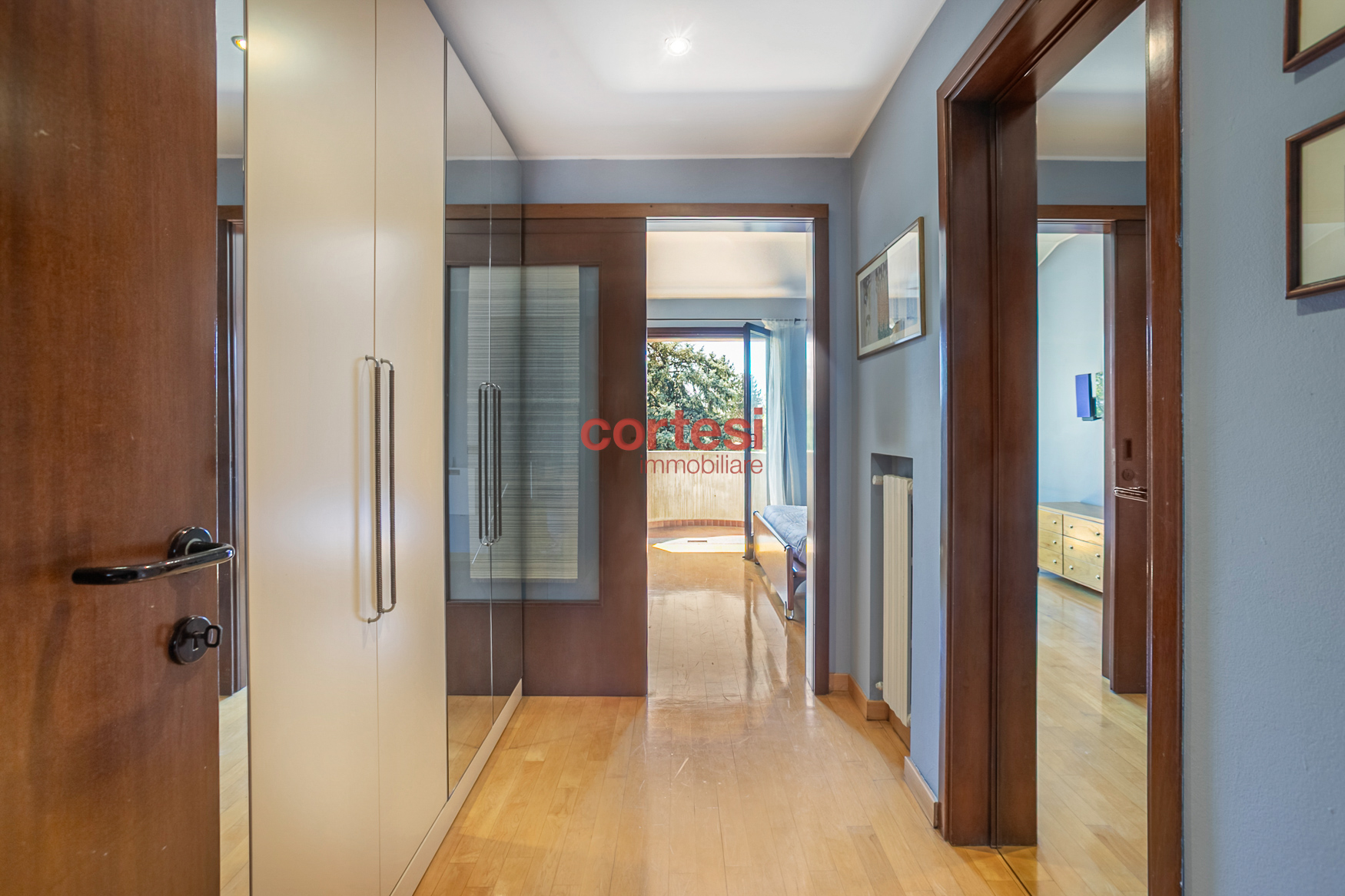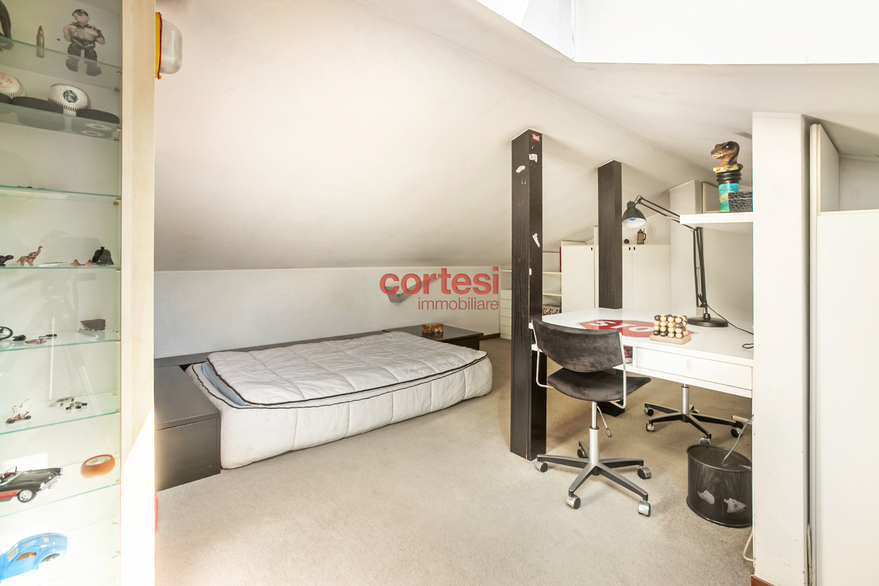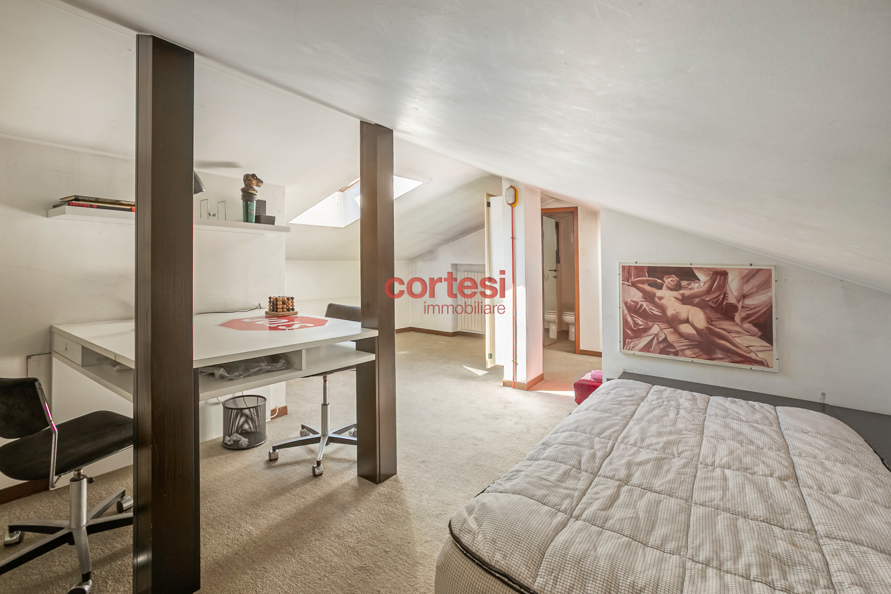 Una scala interna conduce al primo piano, dedicato alla zona notte, dove si trova la camera padronale con balcone affacciato sul giardino e sul parco e bagno en‑suite con vasca in muratura; una seconda camera di generose dimensioni, una camera singola e un bagno con ampia doccia completano il piano. Dal disimpegno si accede inoltre alla mansarda, attualmente adibita a quarta camera con bagno privato, perfetta come spazio riservato o studio.