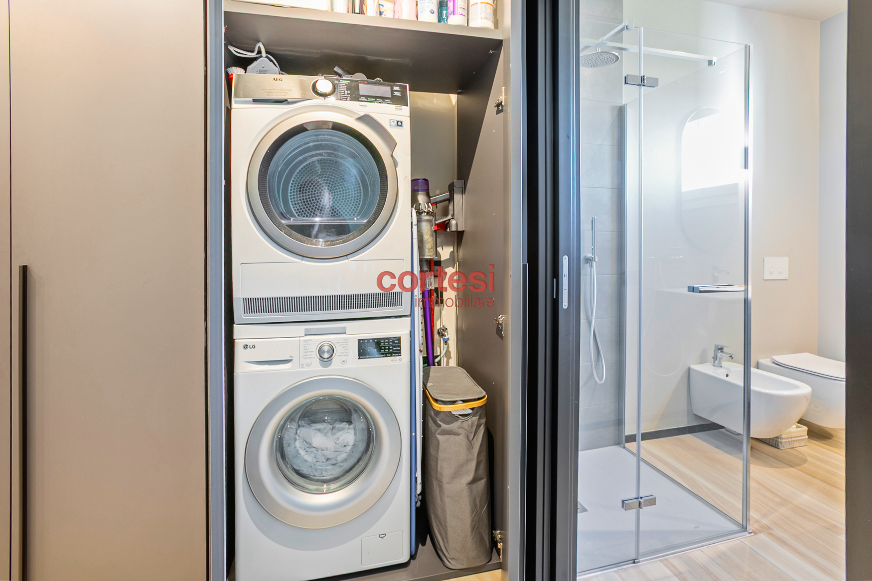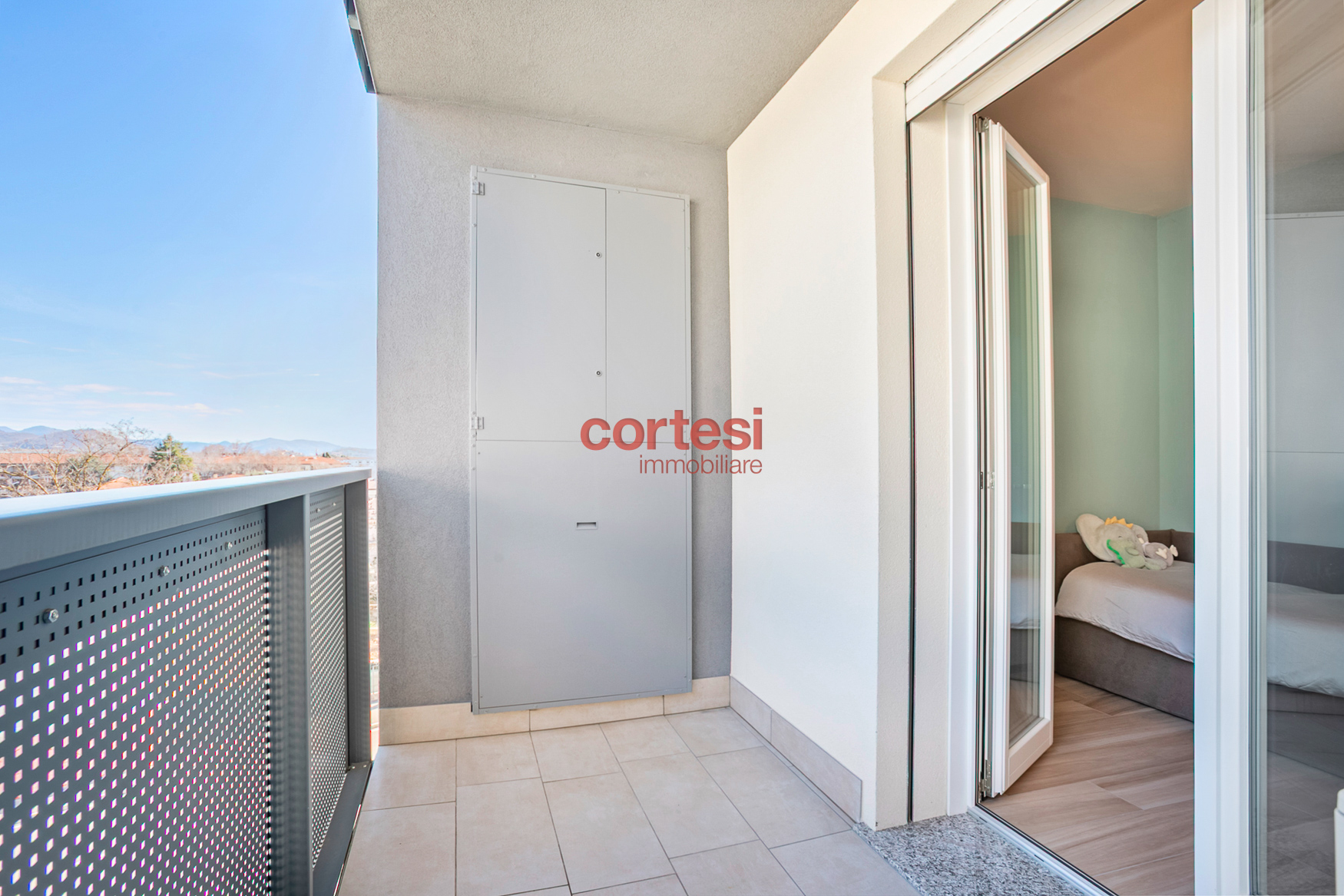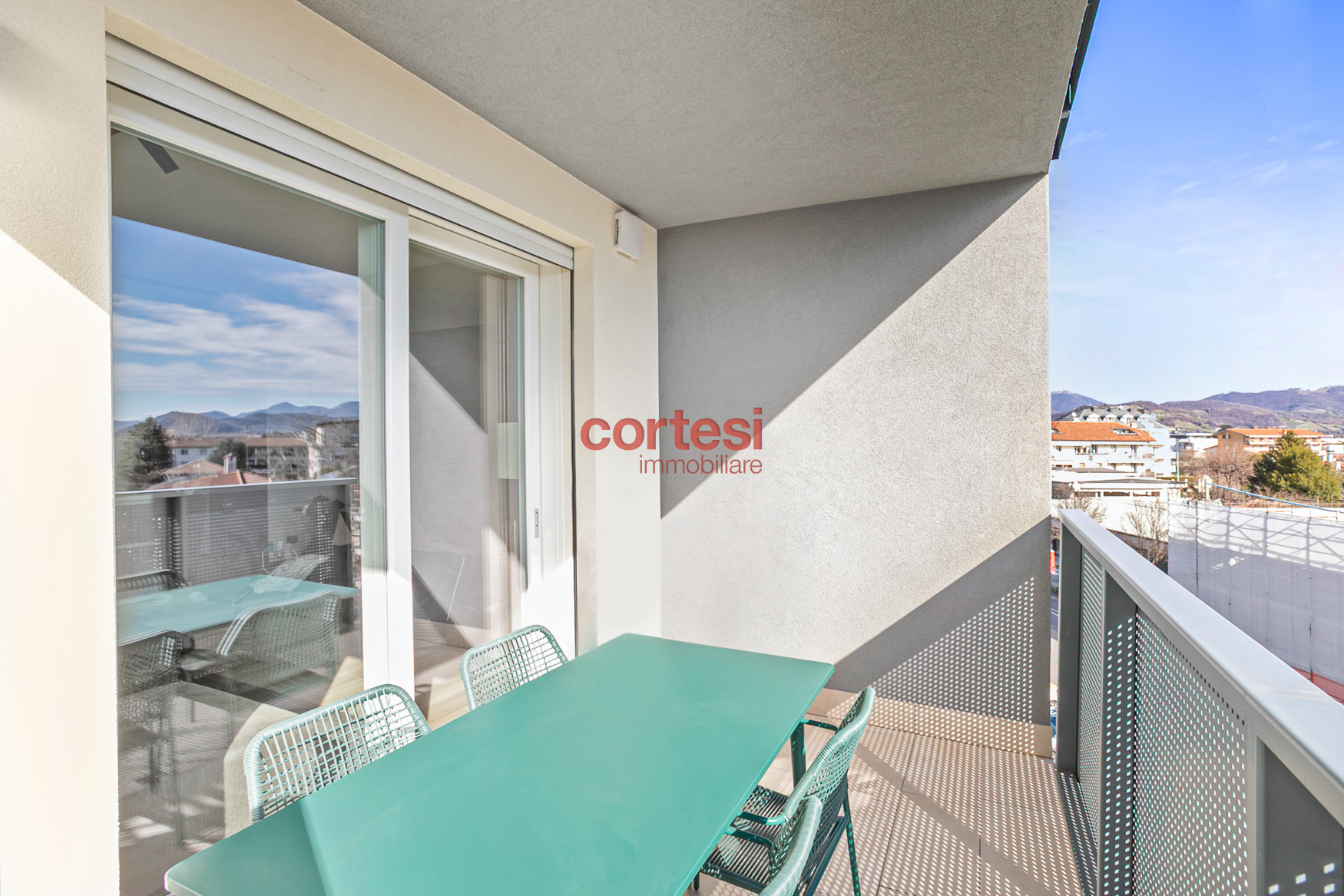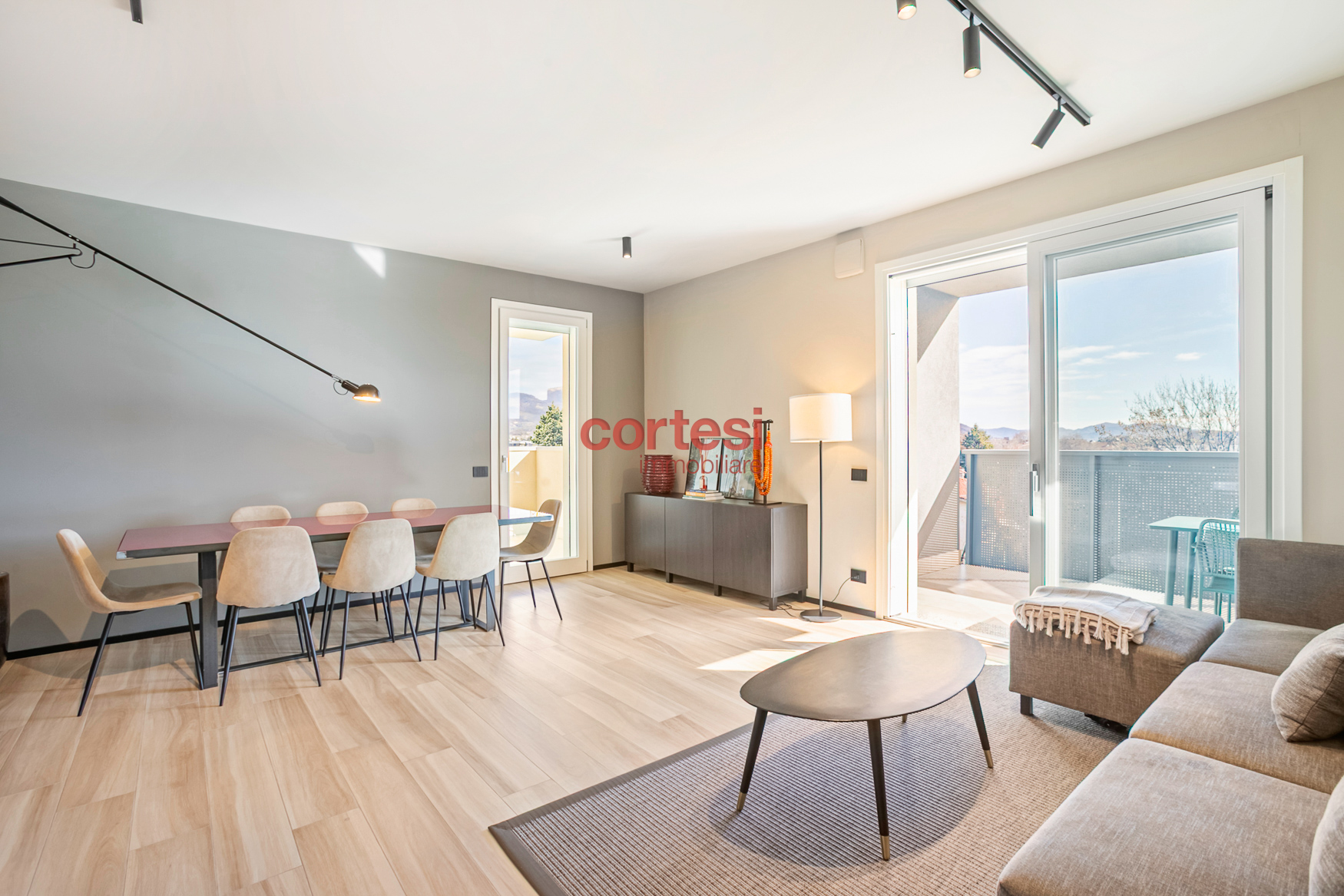 L’ingresso introduce a una zona giorno ampia e luminosa con living e cucina open space, pavimenti in gres porcellanato effetto legno di alta gamma; le due terrazze, dotate di prese elettriche e punti luce esterni, fungono da naturale prolungamento dello spazio conviviale. Il disimpegno notte ospita un’ampia armadiatura a muro che integra il vano tecnico con attacchi per lavatrice e asciugatrice; la camera singola dispone di un balcone di servizio, mentre la camera matrimoniale, con vista sul verde e su Bergamo Alta, è dotata di bagno en suite con ampia doccia walk-in, rivestimenti contemporanei e sanitari sospesi. È presente un secondo bagno di servizio, anch’esso rifinito con cura e dotato di doccia.